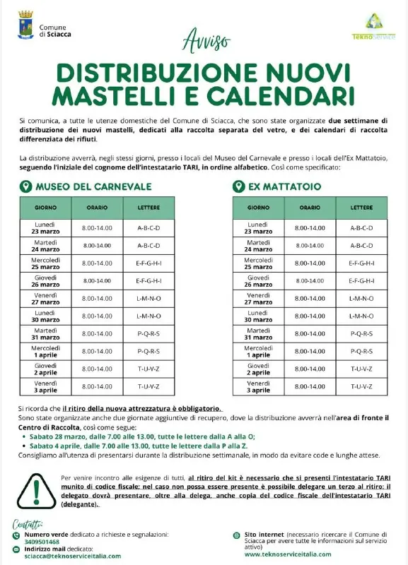 Distribuzione mastelli vetro al via (apri la notifica)Dal 23 marzo inizia la distribuzione dei nuovi mastelli per il vetro e dei calendari. Consulta giorni e modalitĂ di ritiro.