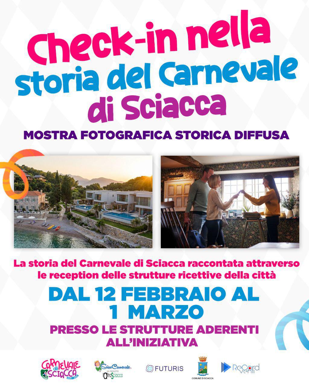 La storia del Carnevale di Sciacca raccontata attraverso le reception delle strutture ricettive della città. dal 12 al 1 marzo presso le strutture aderenti all'iniziativa: Coraje, Antico Granaio, B&B Tommaso Fazello, La Finestra sul Cortile, Casa Vacanze Maniscalco, Il Marchese Hotel & Spa, B&B Conte Luna, B&B Conte Perollo, La lanterna di BaChi, B&B Omer, B&B Il mandorlo di Sciacca, Kéramos luxury rooms, La Casuzza di Lara, Hotel La Paloma Blanca. Evento organizzato dall'Associazione L'AltraSciacca in collaborazione con Futuris, Record Eventi e Comune di Sciacca